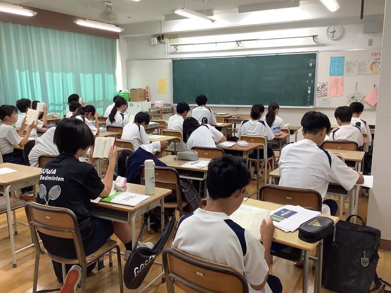 今日からの一週間は、いつもの放送に加えて、図書委員会の生徒たちによる小説の読み聞かせになっています。各クラスでは、静かに物語に耳を傾けている様子がありました。なお、今日紹介されたのは、「15歳のテロリスト」でした。