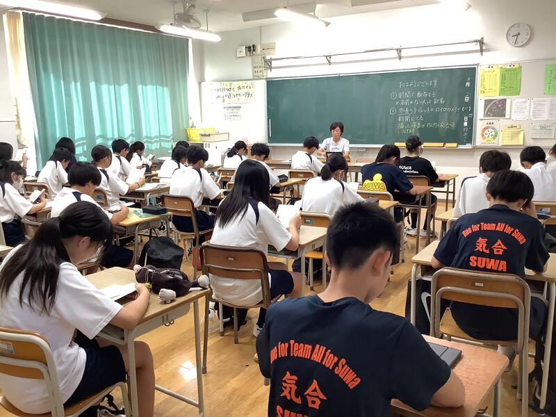 終業式では校歌斉唱がありました。それに先立ち1回だけ全体で練習を行いました。練習後に指揮と伴奏の生徒からアドバイスがありましたが、それだけで本番はグッとよくなっていました。諏訪中生の、話をしっかり聞いてそれを行動に移せる力は素晴らしいと思いました。夏休みは、計画的に過ごすことで価値あるものとし、元気に2学期を迎えられることを願っています。