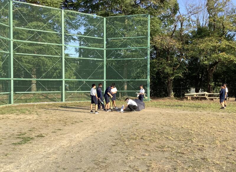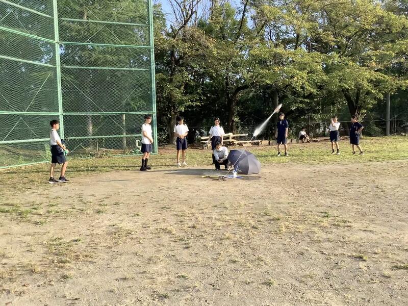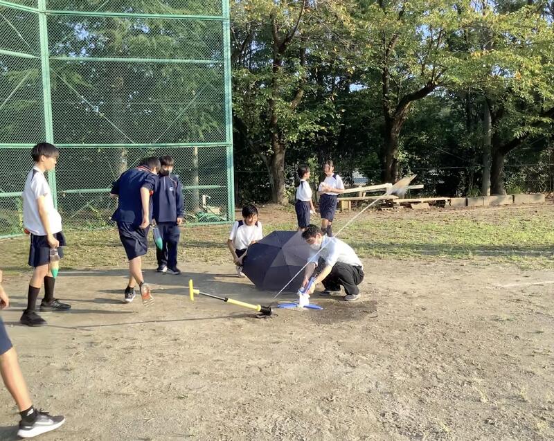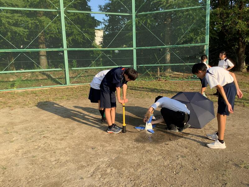 理学•天文部の今日の活動は、ペットボトルロケットでした。水を入れたペットボトルに空気入れで水と空気を圧縮して、勢いよくロケットを飛ばしていました。