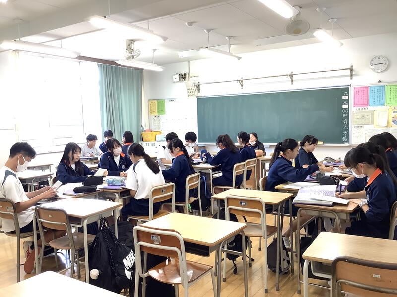 朝学活前の時間を利用して1年生では、校外学習を見据えて班編成をするにあたり、班長の選出アンケートが行われました。自主的に行動できる、広い視野があるなどの観点から班長に相応しいと思われる人を考え、一人ひとりがアンケートに答えていました。