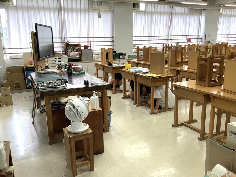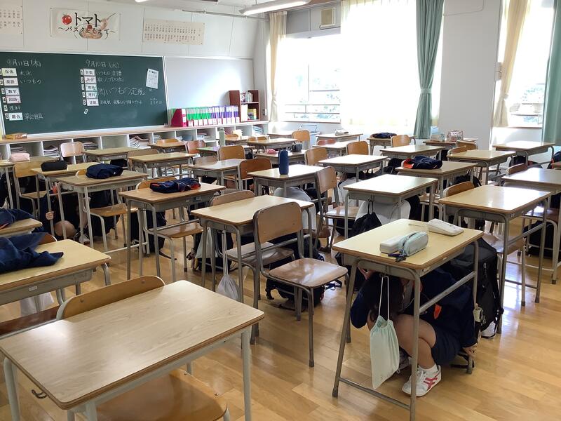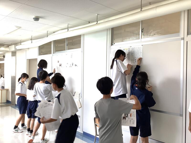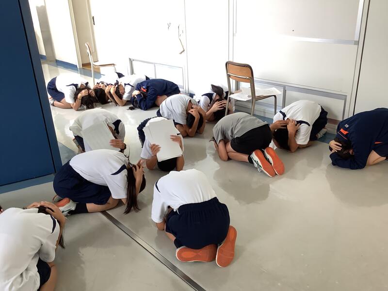1年生の廊下の壁面には、調べ学習で行った仕事新聞を掲示してくれていました。その時に、地震に対する避難訓練があり、安全確保姿勢(シェイクアウト)を素早くとっていました。