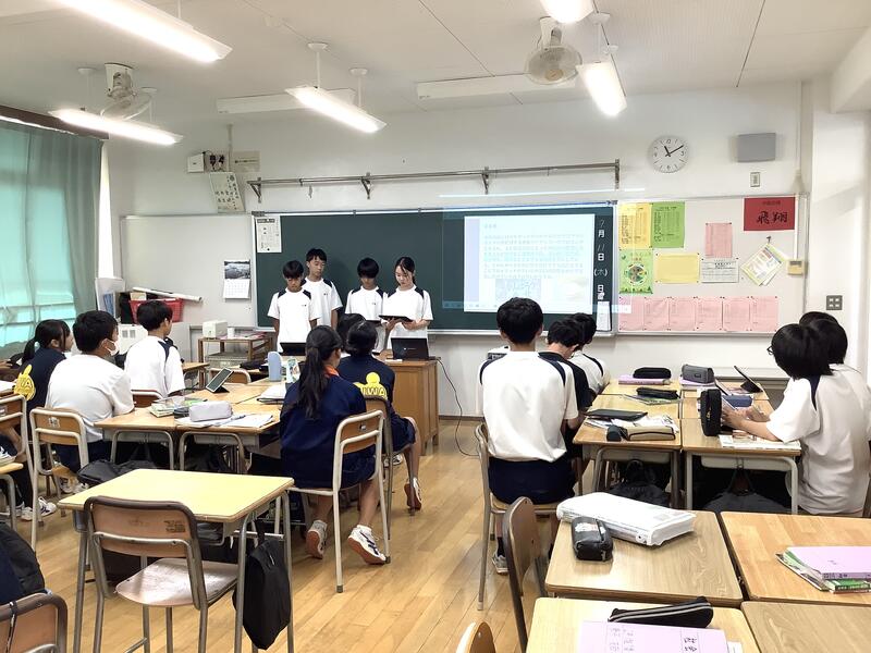 2年生の社会科です。東北地方について班ごとにテーマを決めて、調べ学習を行った結果をクラスで発表を行っていました。限られた短い時間で、よくまとめ上げ、分かりやすく説明できていました。