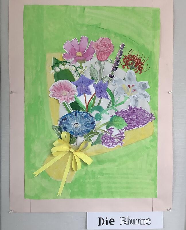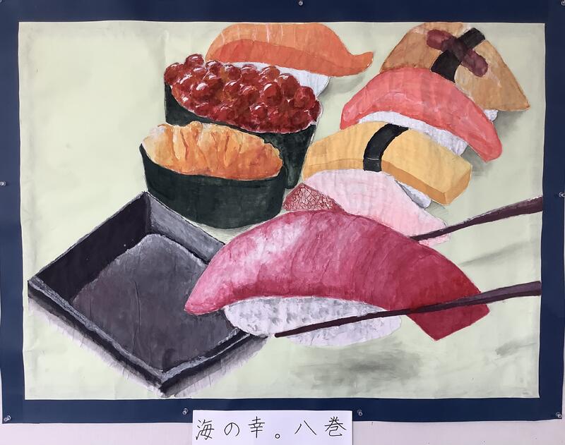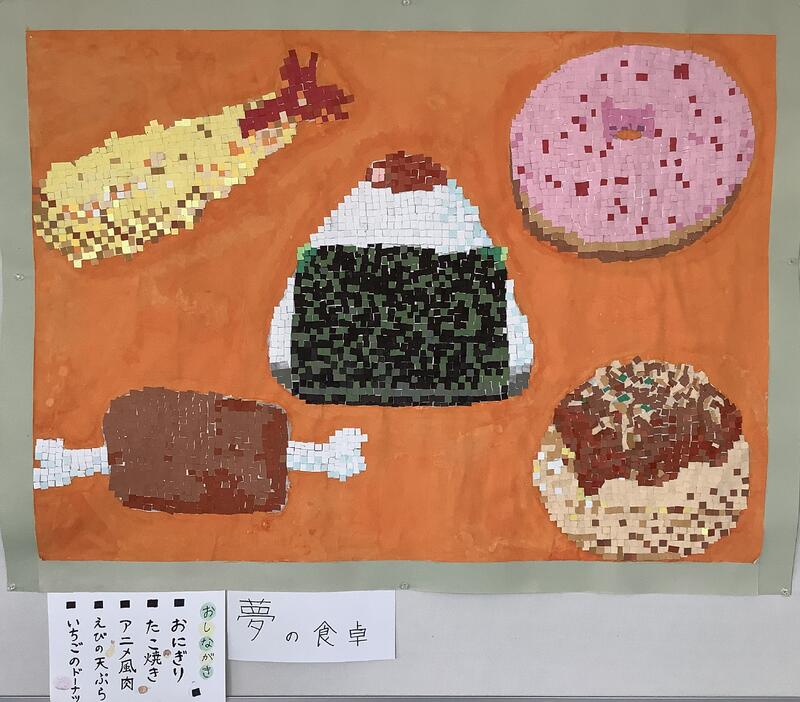 2階の校長室前の廊下の壁には、美術部の作品が飾られました。グループに分かれて作った共同作品です。さすが美術部!という出来栄えのものばかりですね。