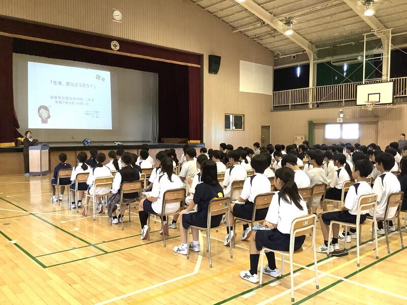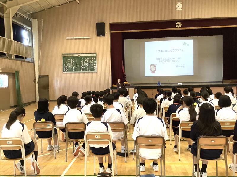 6時間目は総合的な学習です。1年生は、ハローワークから講師の方をお招きして、キャリア教育の一環として、「仕事君はどう思う」と題してお話をしていただきました。