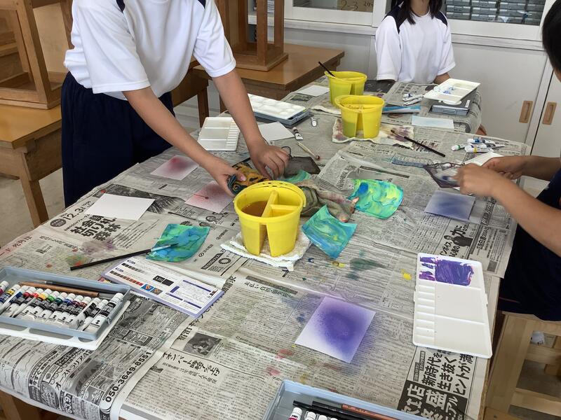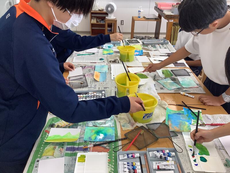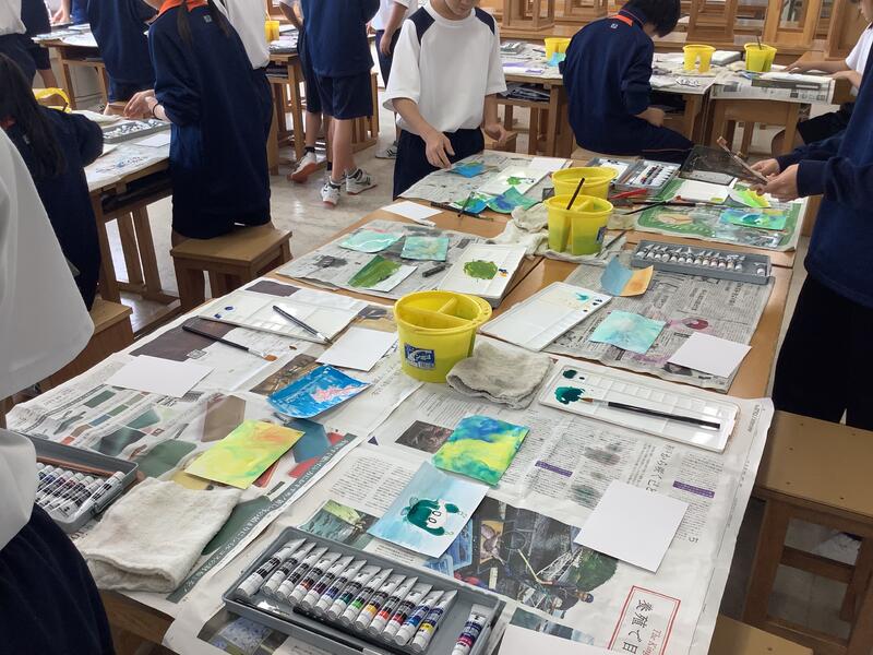 1年生の美術です。モダンテクニックに挑戦しようということで、水彩絵の具を使った様々な技法の学習をしていました(ドリッピング、吹き流し、デカルコマニー)。生徒はお互いの作品を見合いながら楽しげに作品を制作していました。