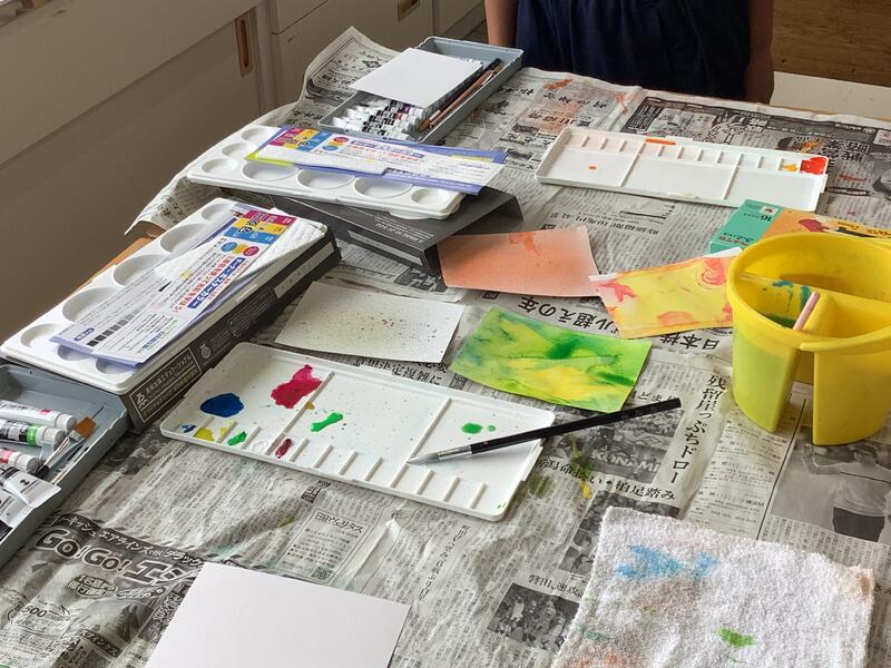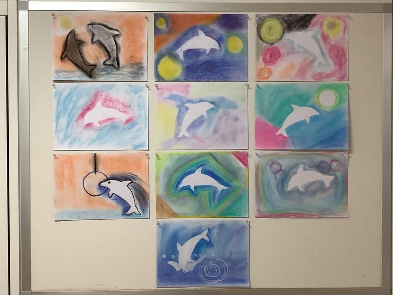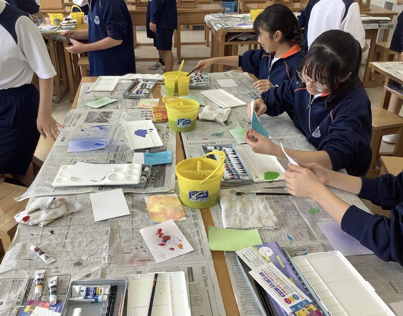 1年生美術では、マーブリングやはじき絵など、様々な水彩画の技法を学んでいました。とてもカラフルな作品がたくさん出来あがっていました。