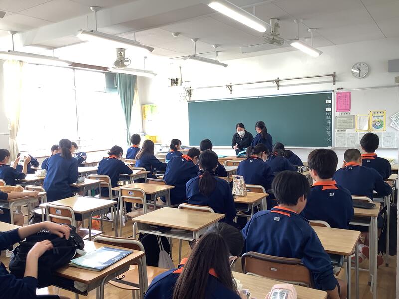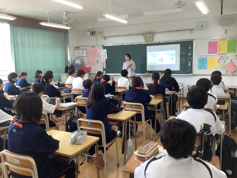 2年生の授業です。魅力的な提案の方法について学ぶことを目標に、班ごとに全体に向けてプレゼンテーションが行われました。まず、①アンケートをとり、②それをもとに資料を作成した上で、③練習を行い提案となりました。限られた準備時間の中で、提案までもってくることは大変だったと思いますが、どの班もしっかり仕上げていました。