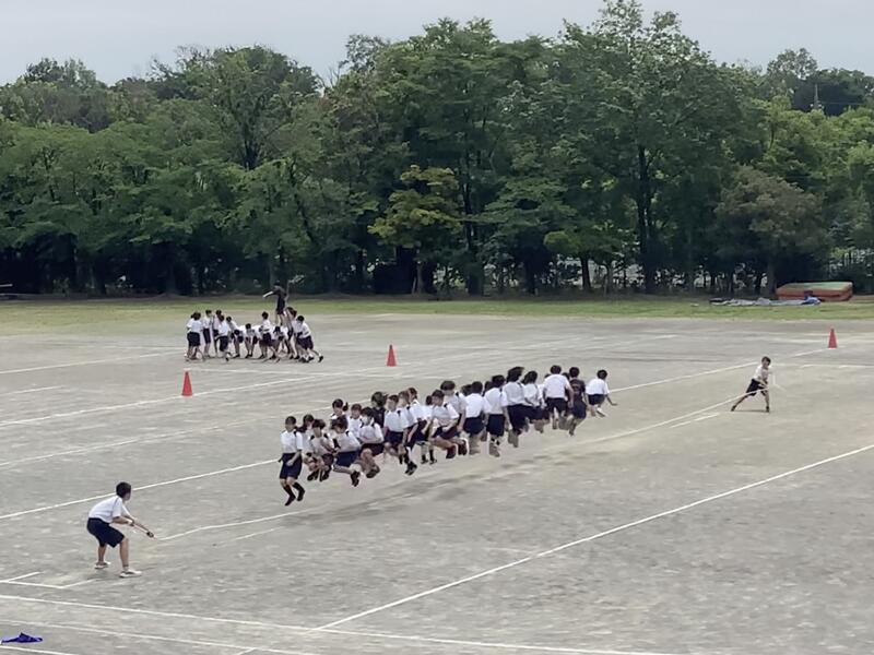 体育の授業の中では、連日運動会の練習行われています。写真は2年生の大縄跳びと学年種目のいかだ流しの練習の様子です。