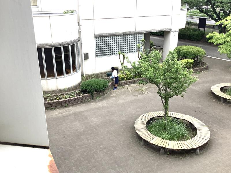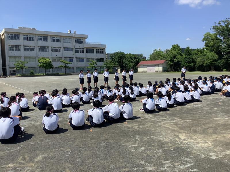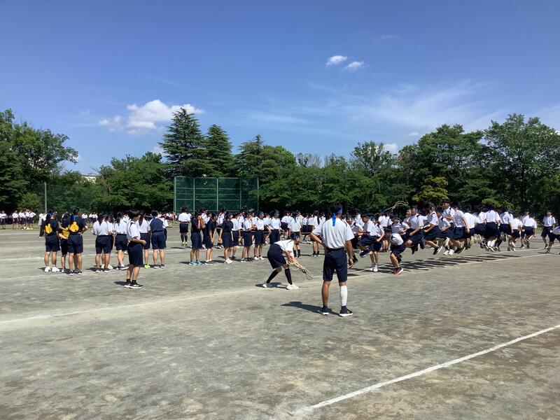 校庭では、昼休み練習として初めて大縄跳びの練習が行われました。回し手の生徒の大きな掛け声で息を合わせて跳んでいました。また、5組の生徒が花壇に水やりをしてくれていました。