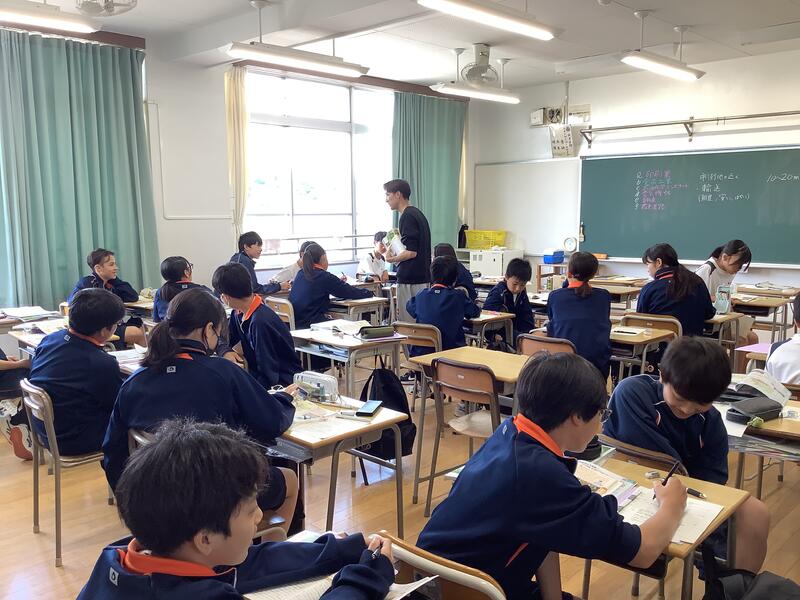 2年生の社会科には、教育実習生が入っています。今日の地理の授業では、班内でお互いの考えを確認し合う時間がとられていました。