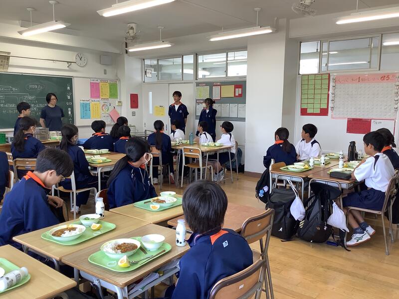 1年生の教室には、3年生が給食の配膳のアドバイザーとして、4時間目が終わるとすぐに1年生の配膳の様子を見に来てくれています。配膳が終わったところで、3年生からは、もっとこうした方がいいよ、とアドバイスを授けていました。