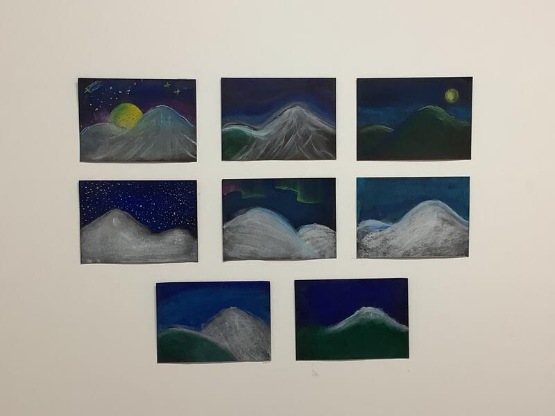 5組の教室前の廊下には、今年度になってから美術の時間に制作した作品が掲示されています。今飾られているのはパステル画です。同じパステル画でも、素材の活用方法によって随分と印象が変わっています。