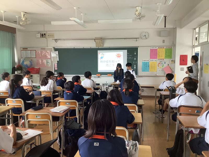 朝の学活の時間を利用して、様々な活動が行われています。1年生のクラスでは、保健給食委員によって、映像資料を活用しながら熱中症への対応について説明を行い注意喚起をしていました。
