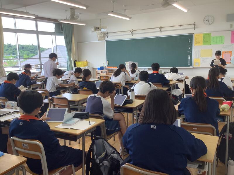 2年生のクラスでは、タブレット端末を使ってアンケート(不登校の未然防止を図るための現状分析や魅力ある学校づくりのためのアンケート)を実施していました。この調査は、全校生徒を対象に年度内あと2回行われます。