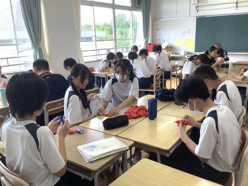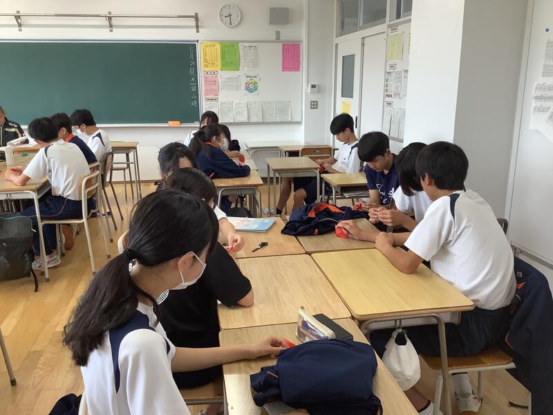 生徒会によるスマイルプロジェクト(広島に千羽鶴を送ろう)が始動しました。折り鶴を一人ふたつずつ作る作業が行われました。折り方を知っている人が教えながらやっていたり、タブレットの画像を見てやっていたりして折っていました。