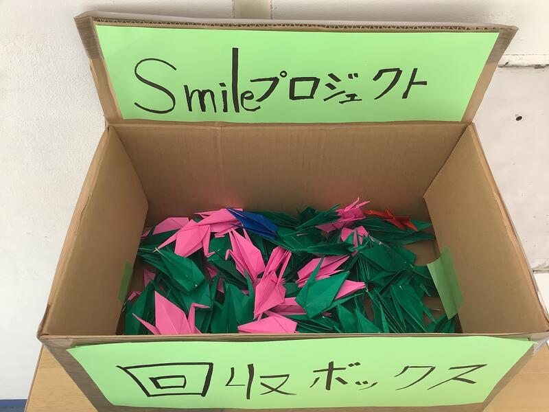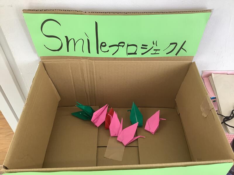 3年生のクラスでは、スマイルプロジェクトとして、折り鶴を作っていました。廊下に置かれた個人で作ってくれた鶴を入れる箱にも、徐々に集まって来ていました。