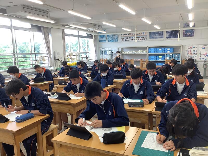 1年生の美術です。自分のお気に入りのものを、形や質感に注意しながら用具を活かして描くというコンセプトで取り組んでいました。対象がお気に入りのものだったので、いつもより生き生きと臨んでいるようでした。