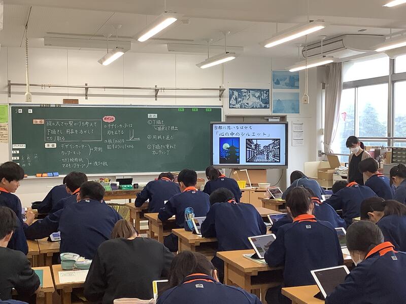 3年生の美術の時間では、修学旅行の事後学習の一環として、京都や奈良の建物等の切り絵の学習をしていました。早い生徒は、デザインした絵をカッターで切り抜く作業に移っていました。