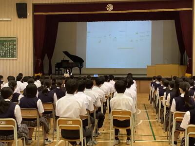 終業式が行われました。校長先生からは、1学期を振り返っての講評、子ども被爆地派遣と平和について、命の大切さとSOSの出し方などのお話がありました。安全に気を付けて充実した夏休みを過ごしてください。