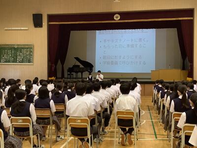 昨日、今日と各学年の学年集会が行われました。各学級の代表生徒(学級委員)から、1学期を振り返り、よかった点と反省点について、さらには、2学期に意識すべきことなどについて報告がありました。また、先生方からは、今学期の成果や課題、夏休みを含め2学期を見据えての準備や心構えについての話がありました。どの学年の生徒も、静かに集中して聞くことができていました。