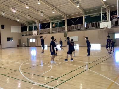 バドミントン部が28日の大会に向けて試合形式の練習に汗を流していました。