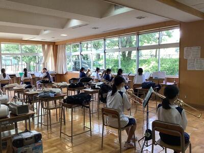 サッカー部は先週の市民大会の準優勝を最後に3年生が引退し、今後は市内中学校との合同チームを編成し、大会に挑みます。吹奏楽部は、8月7日のコンクールを控え、練習に熱が入っていました。