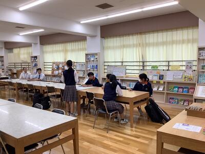中間考査を前に、昼休みの図書室が自習室になっています。今日は、落ち着いた環境で学習を進めたいと思っている生徒が、1•2年生を中心に多く利用し、いつも以上に静かな雰囲気が保たれていました。廊下では、図書委員が貸し出し業務を行っていました。
