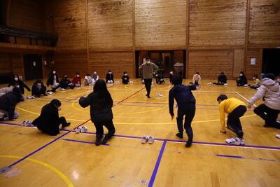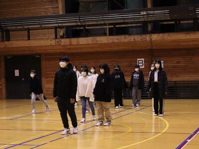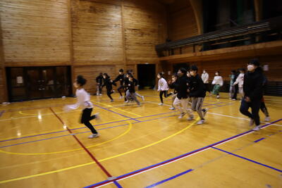 体育館でクラスごとにレクをして仲良く楽しんでいます。1組は「ダルマさんが転んだ」をしていました。2組は「鬼ごっこ」で、担任の先生が鬼になって追いかけ回していました。