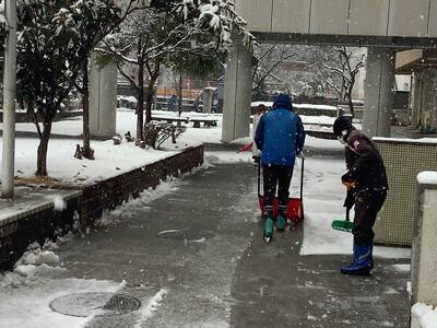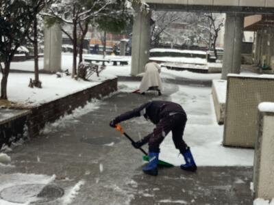 下校時の安全確保のため、先生方が雪かきをしています。気をつけて下校しましょう。