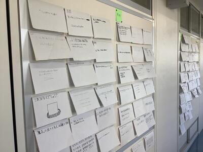 1年生のフロアには、生徒たちが作った期末考査の予想問題がたくさん貼られていました。紙をめくると答えが書いてあり、手軽に確認することができます。学級委員の発案によるものだそうです。