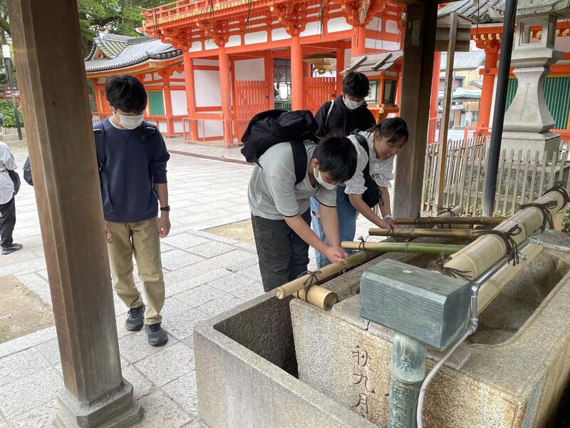 八坂神社を見学中の班です。まだ朝が早いこともあり、空いています。この班は見学終了後、清水寺に向かいました。(五味)