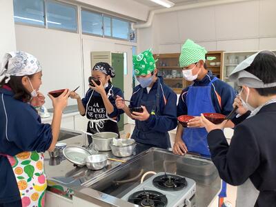 1年生の調理実習です。昆布・カツオだしをとっていました。鍋を見る人、洗い物をする人など、役割分担をしっかりしながら楽しく授業を受けていました。完成した出汁を飲んでみると「おいしい!」という声が各班から聞こえ、自分たちの作った出汁を堪能していました。廊下にもいい匂いが広がっていました。