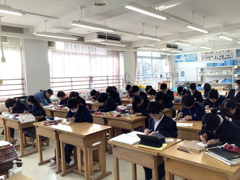 1年生の美術です。オリジナルの家紋作りは、デザイン画が終了し、彫りの作業に入っていました。