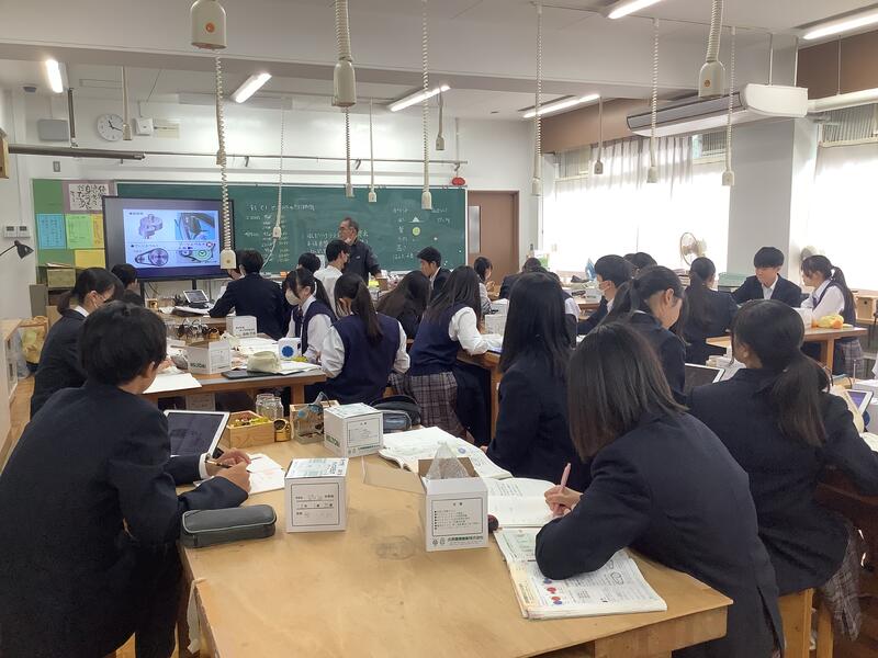 技術の授業です。3年生のクラスでは、ラジオキットの制作が終わり、これまでの学習について、再確認をしていました。2年生のクラスでは、さまざまな発電方法について個人ごとにレポート(新聞)の作成をタブレットで行っていました。