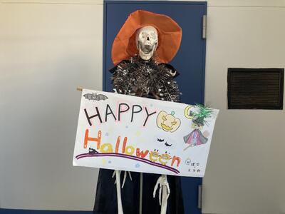 理科室の前では、ハロウィンの衣装を着たガイコツ(人体模型)がお出迎えです。理学天文部の生徒たちが飾り付けてくれたようです。