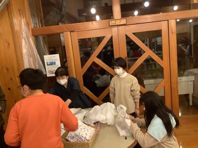 ホールでお土産を購入する生徒たちで大賑わいです。先生方もお手伝いをしています。