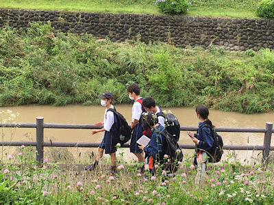 班ごとにテーマを設定し、多摩市市内で調査活動をしています。写真は河川の防災対策を調査している様子です。