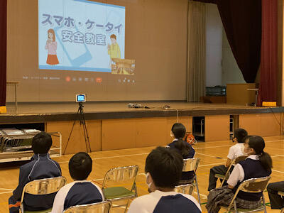 今年度のセーフティ教室は、スマホ・ケータイ安全教室です。SNSの安全な利用についてオンラインで学習しています。密を避けるため、1年生は体育館、2年生は多目的ホール、3年生は各教室に分かれて実施しました。