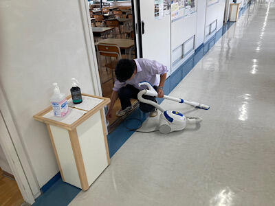 生徒が登校前の学校では、先生がサーキュレーターや消毒液の準備、掃除などをしています。コロナ感染拡大による短縮授業期間中ですが、気を緩めることなく教育活動を行なって行きます。