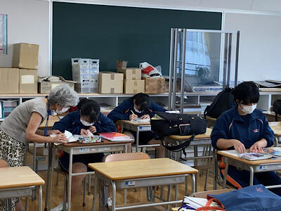 中間テストを来週に控え、放課後に残って自習をしています。学習支援員さんが優しく教えてくれていました。