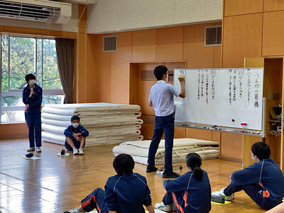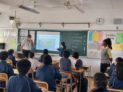 2年生の英語では、ニュージーランド人とジャマイカ人の先生がそれぞれの国の文化について、スライドを使いながら紹介してくれました。参観していた先生方にも突然質問が振られ、返答に戸惑ってしまうシーンもあり、とても楽しく学習することができました。