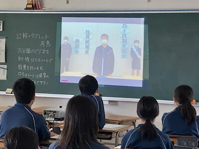 各教室で動画での演説会では、各立候補者が諏訪中生徒会活動に対する思いや、実現したい取り組みについて熱く語っていました。