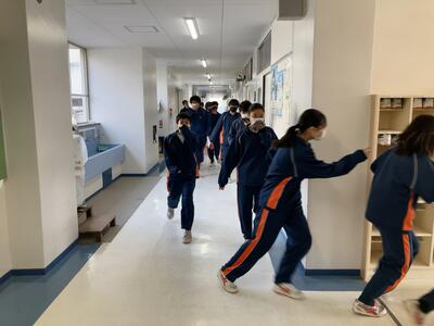 今回は休み時間中に火災が発生したと想定した訓練を行いました。それぞれがいる場所から火災発生箇所を避けて各自の判断での避難となりましたが、迅速に校庭へ避難することができました。