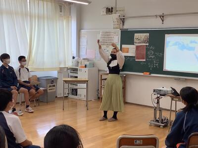 3年生では、イラン、エジプト、ジョージアからの留学生の方々をお招きして授業を行いました。1時間目は、生徒たちが日本の文化について英語でプレゼンテーションをしました。事前に原稿やスライドを準備して、リハーサルも行っていましたが、とても緊張している様子でした。逆に英語で質問をされてドギマギする場面もありましたが。英語でコミュニケーションを取ることができて、自信につながったことと思います。
