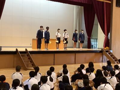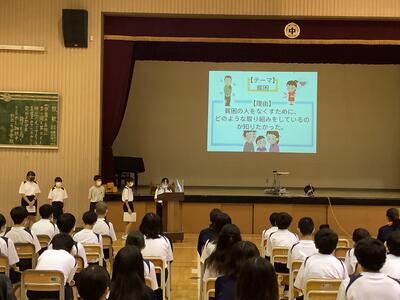 前期最後の生徒会朝礼が行われました。生徒会長、各専門委員長が前期の活動目標に対する達成度などを発表しました。