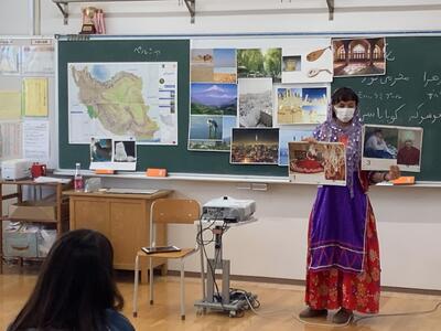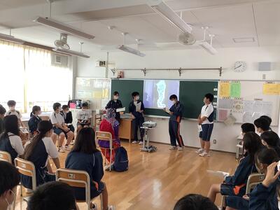 3年生では、イラン、エジプト、ジョージアからの留学生の方々をお招きして授業を行いました。1時間目は、生徒たちが日本の文化について英語でプレゼンテーションをしました。事前に原稿やスライドを準備して、リハーサルも行っていましたが、とても緊張している様子でした。逆に英語で質問をされてドギマギする場面もありましたが。英語でコミュニケーションを取ることができて、自信につながったことと思います。
