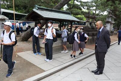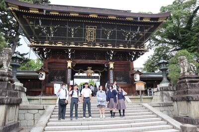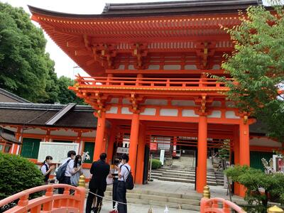 上賀茂神社を見学中の班です。タクシーの運転手さんからは、中学生の修学旅行で上賀茂神社は珍しいと言われていました。後ほど、神社の売店で、賀茂茄子・ヤタガラスの入れ物に入ったおみくじや、お守りを買っていました。(五味)