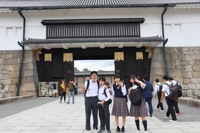 タクシー行動で二条城へ。世界各地から観光客が来ています。天気も少し良くなりました。この班は、見学後に運転手さんおすすめのラーメン屋さんで昼食を食べる予定だそうです。(立川)