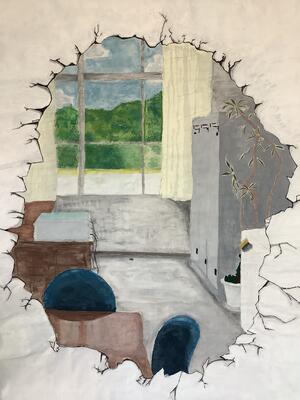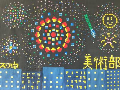 美術部が共同制作した作品が校長室の前の廊下に展示されています。1学期から夏休みにかけて、部員で協力して丁寧に取り組んでいました。不思議な、そして、気持ちが明るくなる作品ですね。