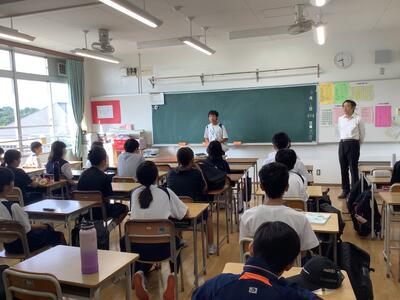 4日に引き続いて、朝の学活時に各クラスをまわっての演説が行われました。写真は、2年生の候補者が1年生の教室を訪れた時の様子です。